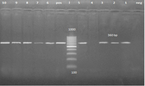 PCR product about 360 bp. Lane 1, 2, 3, 5, 6, 7, 8, 9 and 10 are positive samples while lane 4 is negative sample.