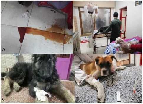 a) Bloody watery diarrhea of CPV infected dog. b) Fluid therapy and blood transfusion for treatment of CPV infected Dogs. c) Husky dog suffering from lethargy and diarrhea due to CPV infection. d) Diagnosis of CPV infection in pit bull dog using Rapid CPV Ag test kit.