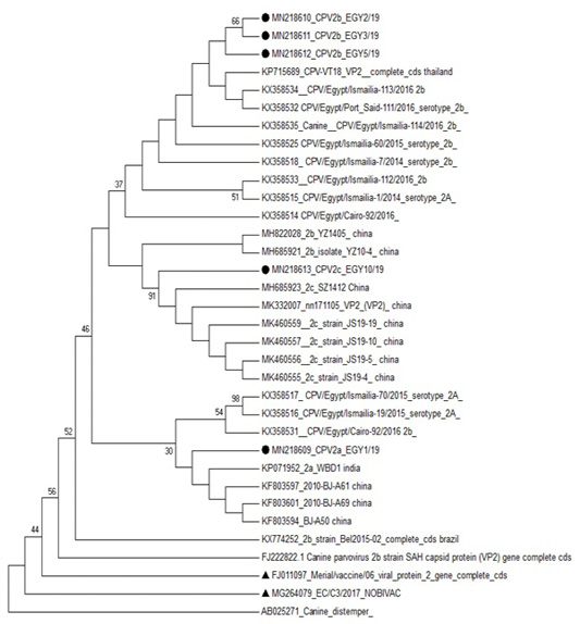 Phylogenetic analysis based on VP2 for the studied isolates against different sequences of canine parvovirus in Gen Bank. Studied samples were marked with dark circle and vaccine strains were marked with dark triangle.