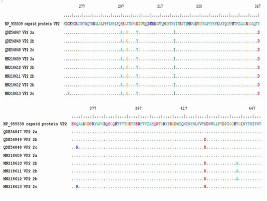 Multiple alignment of translated protein of studied variant (2a,2B,2C) against reference complete (VP2) and partial sequences in Gen-Bank.