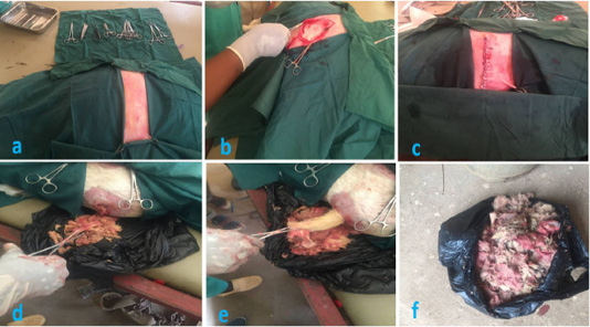 Showing the surgical procedure undertaken. (a) Triangular draping of the surgical field. (b) Incision into the abdomen via the paralumber fossa in order to exteriorize the punctured uterus for lavage and treatment. (c) Removal of the macerated fetus via the external opening. (e) Pulling of the skin remnant from the macerated fetus. (f) Complete macerated fetus removed from the uterus.