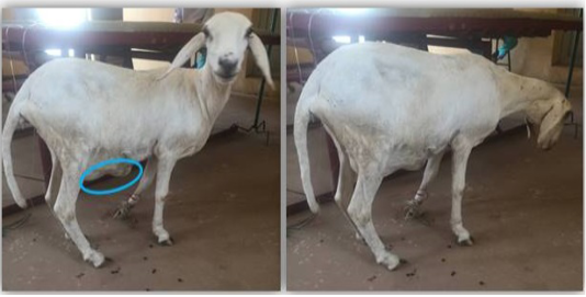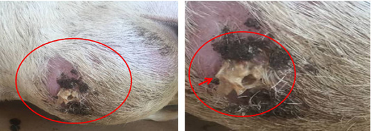 The patient on presentation showing the burst swelling on left lateral recombency. The circumscribed area shows the pus with protruding fragment of fetal bone (arrow head).