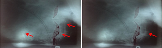 Lateral radiograph of the abdominal cavity showing the dismembered fetal bones. Red arrows showing dismembered fetal bones.