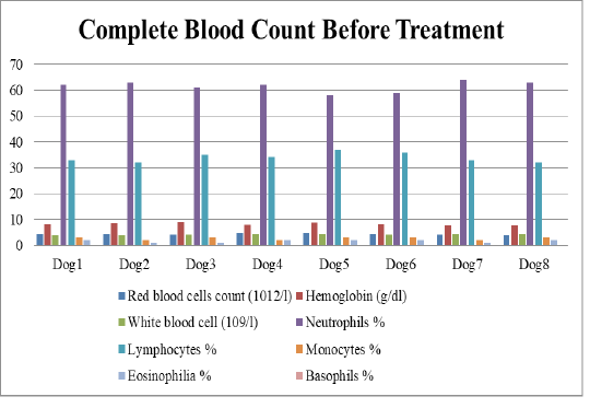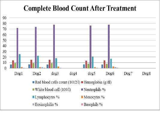 Complete blood count test after treatment of 5 days show great improvement in health status of puppies. Dog 4, 7, 8 has been expired due to severe condition.