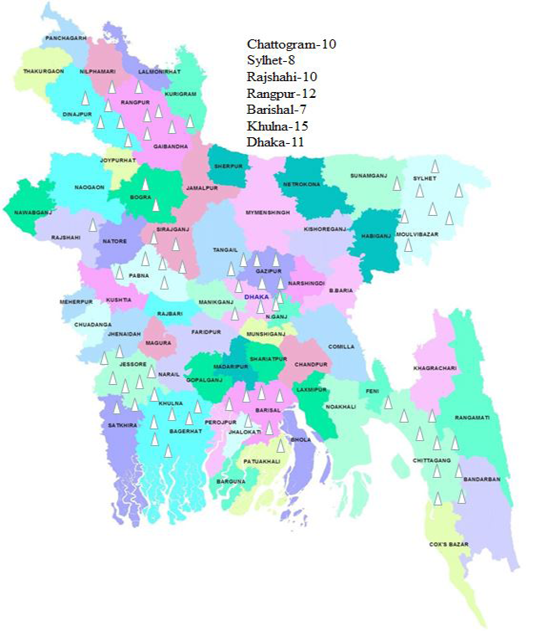 Geographical distribution of commercial dairy farms marked as white triangle located in different regions of seven divisions in Bangladesh.