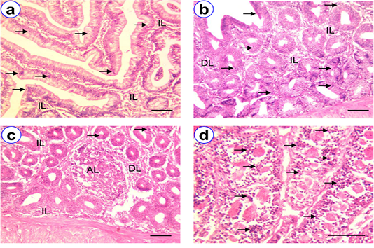 HE staining of colo-rectum at D180 (a~b) showing intraepithelial lymphocytes (arrow), isolatory lymphocytes (IL), diffuse lymphocytes (DL), aggregated lymphocytes (AL); Scale bar = 50 µm (a~b).