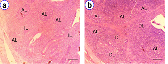 HE staining of cecal tonsil at D90 (a) and D180 (b) showing isolatory lymphocytes (IL), diffuse lymphocytes (DL), aggregated lymphocytes (AL); Scale bar = 50 µm (a~b).