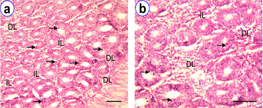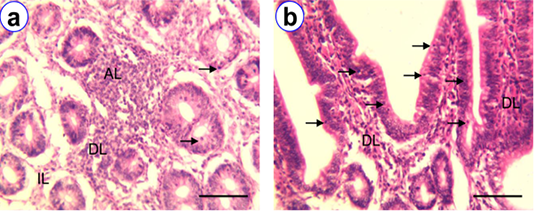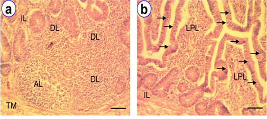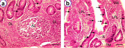 HE staining of ileum at D90 (a~b) showing intraepithelial lymphocytes (arrow), isolatory lymphocytes (IL), diffuse lymphocytes (DL); Scale bar = 50 µm (a), 100 µm (b).