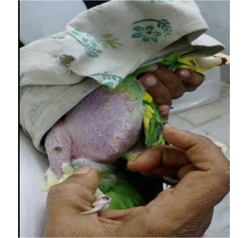 Amazon Parrot- Avian Pox-wart like lesions on the right thigh, breast and toes