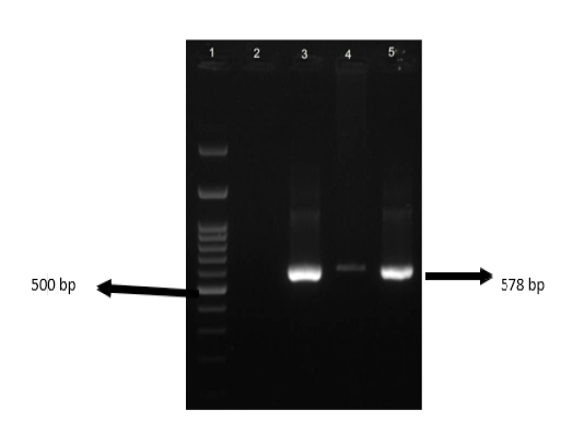 PCR- 100 bp Ladder (1), negative control (2), lesions over the breast (3), toes (4) and thigh (5).