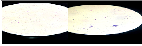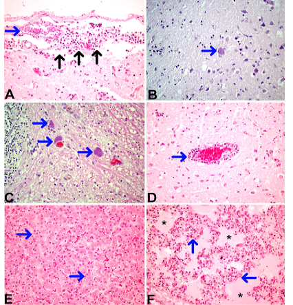 Lymphocytic pleocytosis in CSF examination. Blue arrows indicate lymphocytes