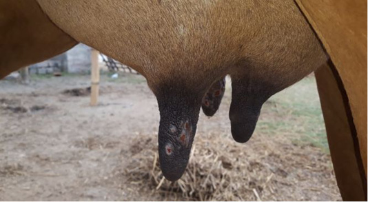 Typical ulcerative lesion of bovine herpes mammilitis on teats.
