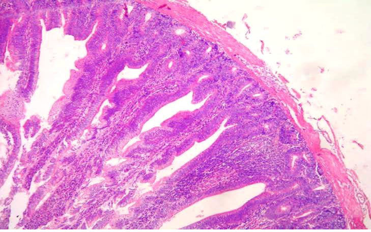 Section of intestine showing sloughing of villli and heterophillic infiltration)