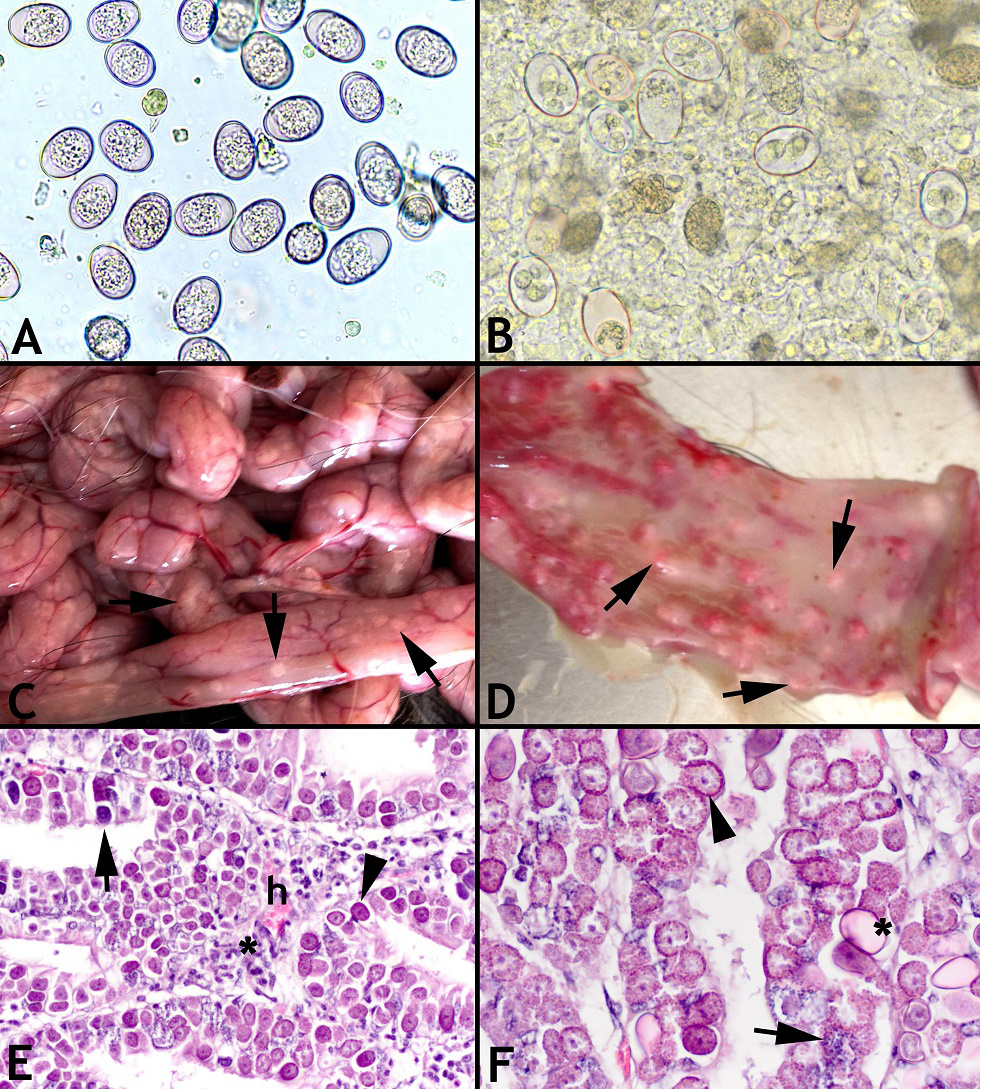 A. Unsporulated oocysts in feces detected with flotation examination; B. Sporulated oocysts in feces detected with flotation examination; C. Severe and diffuse noduler hyperplasia (arrows) in intestine serosa; D. Severe and diffuse noduler hyperplasia (arrows) in lumen of duodenum; E. There were macrogamont (arrow head), microgamont (arrow), hyperemi (h), neutrophil and eosinophil infiltration with severe plasmacyte and lymphocyte (asterisk); F. There were macrogamont (arrow head), microgamont (arrow) and oocyst stages of E. arloingi (asterisk) in intestinal epithelium