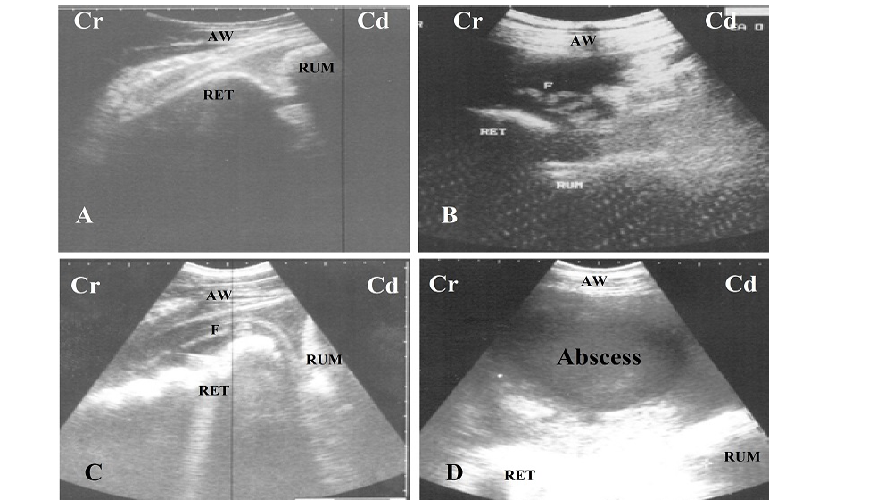 B and C. Ultrasonogram of reticulum in case of foreign body syndrome, it appears corrugated and surrounded by inflammatory echogenic fibrin (F);