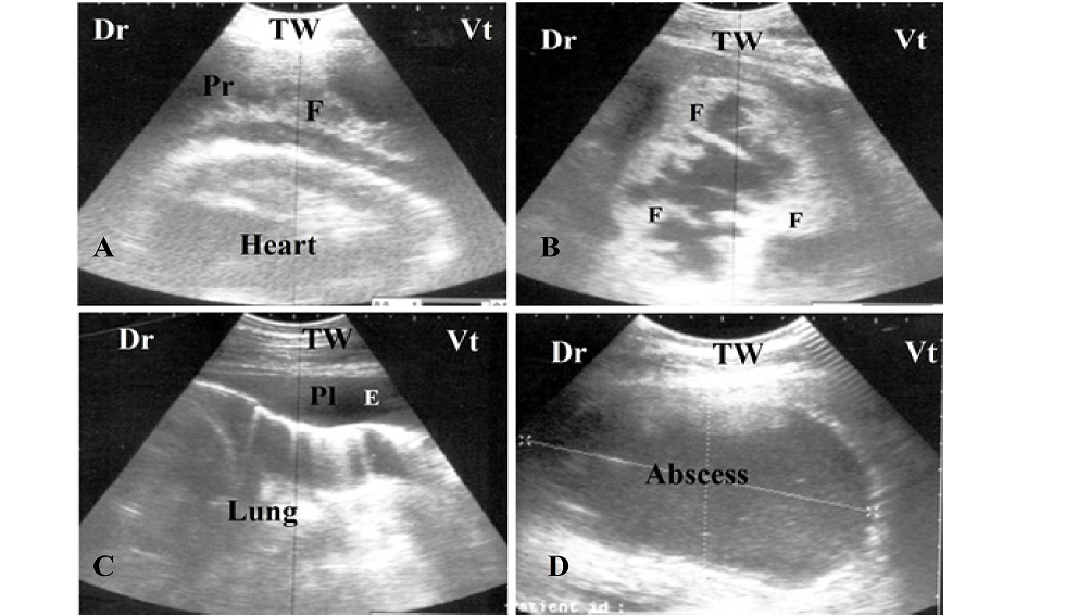 A and B. Ultrasonogram of a buffalo with pericarditis, notice the presence of echogenic fibrin (F) interspersed in pericardial sac (Pr);