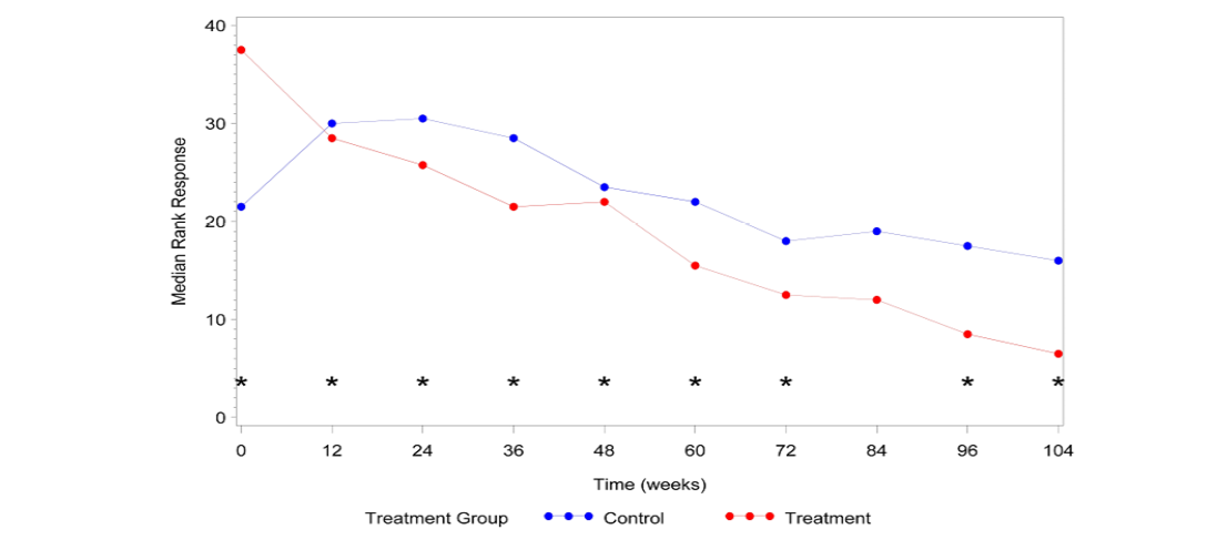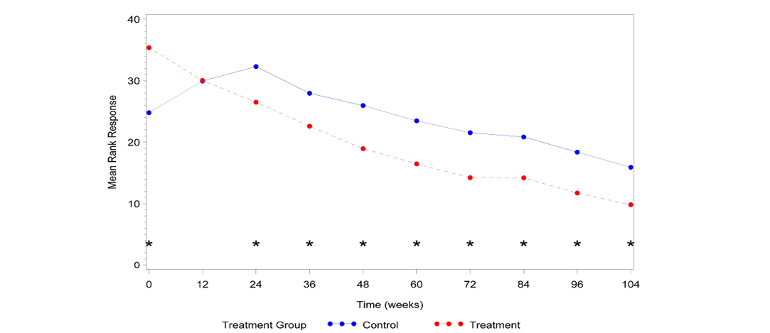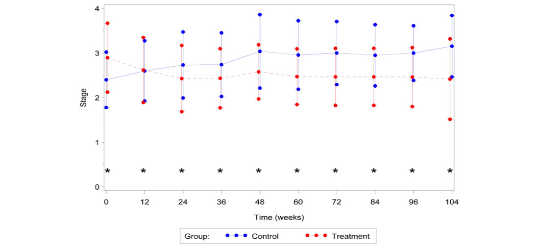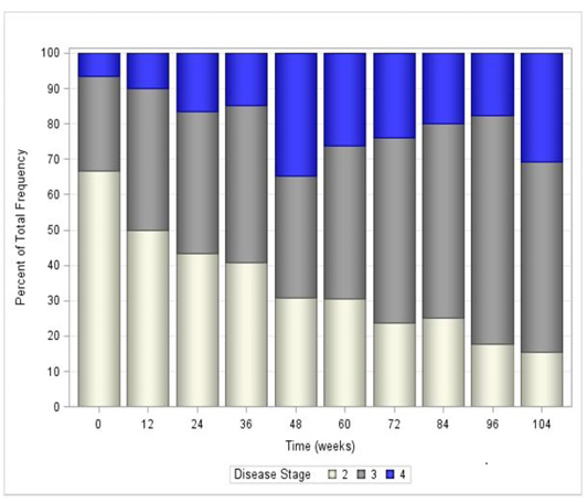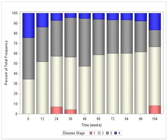 Cumulative IRISa disease stage frequencies in treatment group vs. Time
