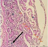 a) Infiltrations of inflammatory cells in the submucosa layer; b) loss of architecture in Crypt of Lieberkuhn; c) necrosis of the Brunners’ gland in the small and large intestine