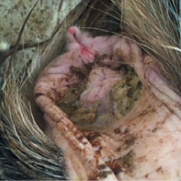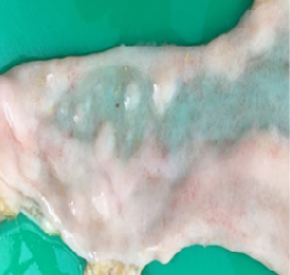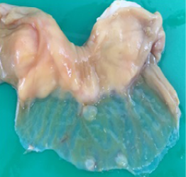Transparent thinning of the intestinal wall indicative of necrotizing enteritis