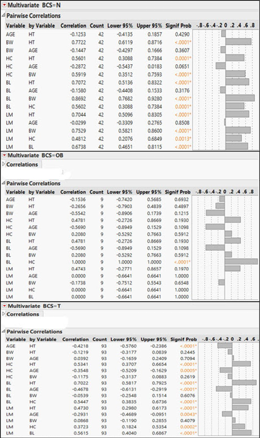 Pairwise correlation between the zoometric measurements in Nigerian indigenous dogs with ideal, obese and thin BCS