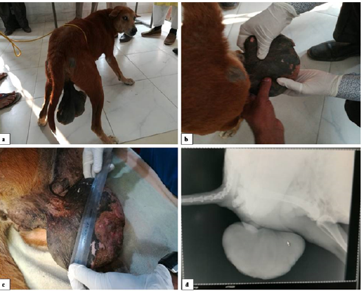 Clinical findings a. Dog before surgical correction, b. Palpation of tumor mass c. measurement of tumor mass and d. Radiological findings