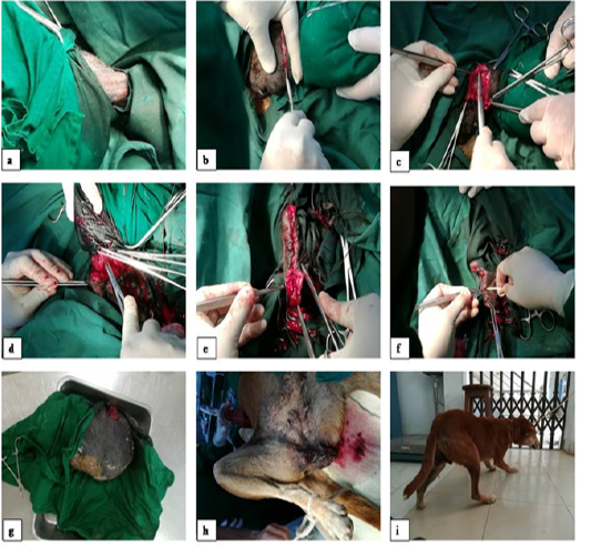 Surgical procedure, a. : Aseptic preparation of surgical site, b. Incision at base of tumor, c. Blunt dissection to separate subcutaneous tissue, d. Hemostasis by clamping and ligation, e. Subcutaneous closure by catgut, f. Skin closure by silk, g. Resected tumor mass, h. After surgery tumor area, i. dog after surgery and recovery from anesthesia
