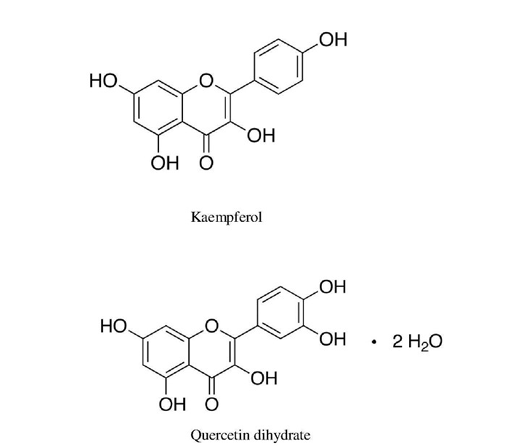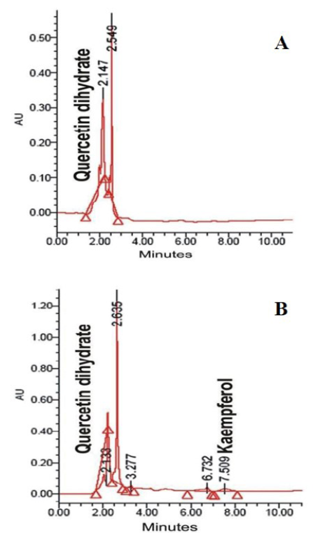 A) HPLC analysis of hot aq. Extract of pods (HAEP) displaying the presence of Quercetin dihydrate; B) HPLC analysis of hot aq. Extract of leaves (HAEL) displaying the presence of Quercetin dihydrate and Kaempferol