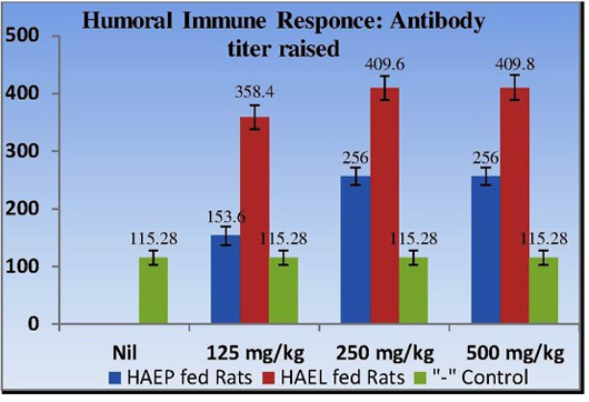 Determining the humoral immune response of albino rats by measuring antibody titer in rats fed with 125, 250 and 500 mg/kg of HAEP and HAEL with respect to control