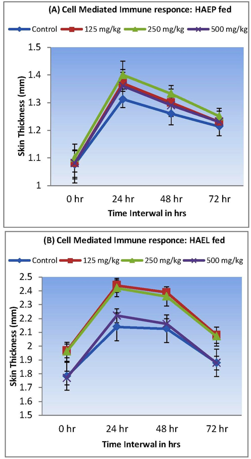 A) Increase in skin thickness of albino rats fed with 125, 250 and 500 mg/kg of HAEP recored at 24, 48 and 72 hrs time intervals with respect to control; B) Increase in skin thickness of albino rats fed with 125, 250 and 500 mg/kg of HAEL recored at 24, 48 and 72 hrs time intervals with respect to control