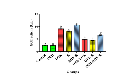 The protective effects of olive oil with fig & date palm extracts (OFD) on serum gamma glutamyl transferase (GGT) activity of doxorubicin (DOX) and/or gamma irradiated (R) groups. Columns not sharing common superscript letters are significant with each other at p<0.05.