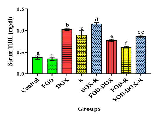 The protective effects of olive oil with fig & date palm extracts (OFD) on serum total bilirubin (TBIL) of doxorubicin (DOX) and/or gamma irradiated (R) groups. Columns not sharing common superscript letters are significant with each other at p<0.05.