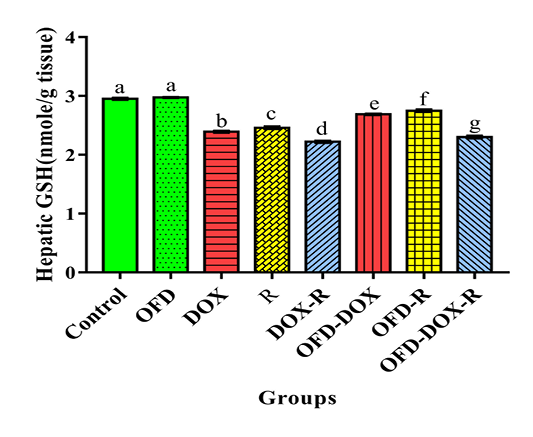 The protective effects of olive oil with fig & date palm extracts (OFD) on hepatic reduced glutathione (GSH) of doxorubicin (DOX) and/or gamma irradiated (R) groups. Columns not sharing common superscript letters are significant with each other at p<0.05.