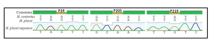 Sequence chromatogram of 1 out of 66 sequences (named H. placei sequences) obtained from 4 populations showing three fixed species-specific positions (P24, P205, P219) of the rDNA ITS-2 sequence of H. placei
