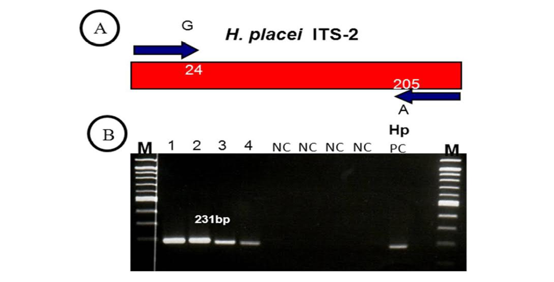 (A) H. placei has fixed nucleotide sequence differences at position 24 and 205 of the ITS-2 sequence. This allowed the design of forward and reverse primers for which the final 3’ base was complementary to these positions and so specific respective species. (B) ITS-2 products amplified with H. placei allele-specific primers. M, 100bp ladder; Tracks 1-4; amplicons from H. placei single worm DNA templates, Tracks 5-8; (NC) no template negative control; HP PC, H. placei positive control
