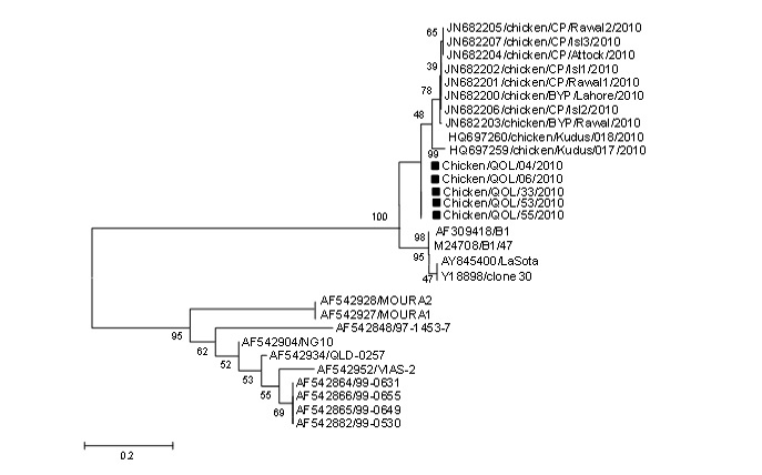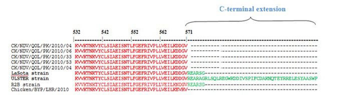 Sequence alignment of C-terminus of HN gene of various NDV strains, the sequences of the current study, LaSota (JF950510), Ulster (M19478), R2B (JX316216) and previously characterized PAK strains Chicken/BYP/Lahore/2010 (JN682200). The C-terminus amino acids are colored green