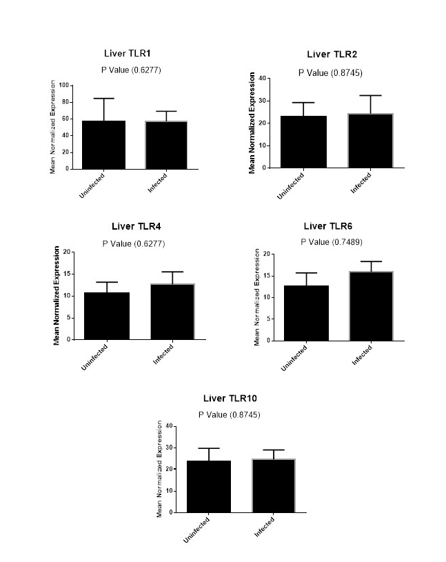 Expression levels of TLR1,TLR2, TLR4,TLR6 and TLR10 genes in liver tissues collected from animals with and without endometritis. The expression levels of these genes were normalized to RPL0 and GAPDH and calibrated with the average of control. Expression levels were obtained from three pooled biological replicate samples ± S.E.M.