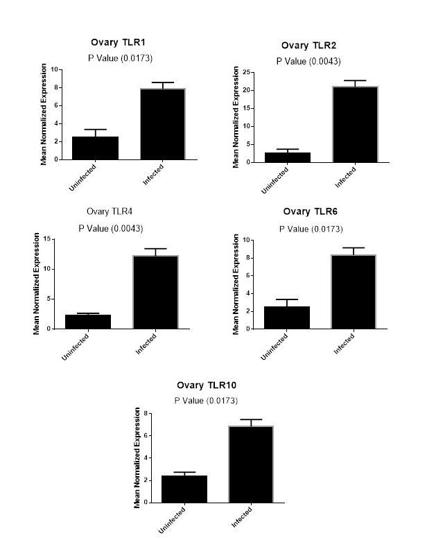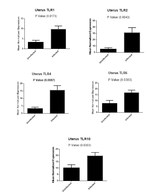 Expression levels of TLR1,TLR2, TLR4,TLR6 and TLR10 genes in ovarian tissues collected from animals with and without endometritis. The expression levels of these genes were normalized to RPL0 and GAPDH and calibrated with the average of control. Expression levels were obtained from three pooled biological replicate samples ± S.E.M.