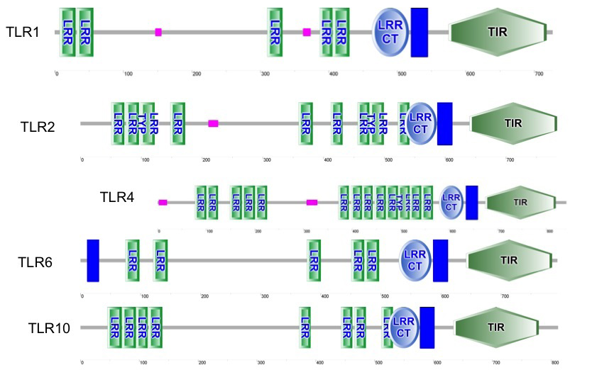 predicted functional domains in tested TLRs of Bubalus bubalis, with and without endometritis (vertical bar is transmembrane domain (TM)