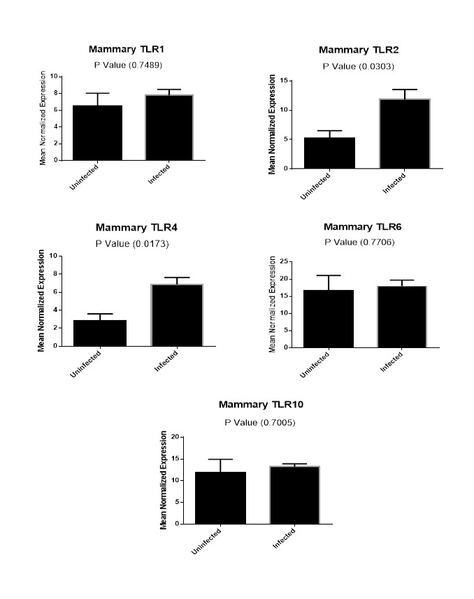 Expression levels of TLR1,TLR2, TLR4,TLR6 and TLR10 genes in mammary gland tissues collected from animals with and without endometritis. The expression levels of these genes were normalized to RPL0 and GAPDH and calibrated with the average of control. Expression levels were obtained from three pooled biological replicate samples ± S.E.M.