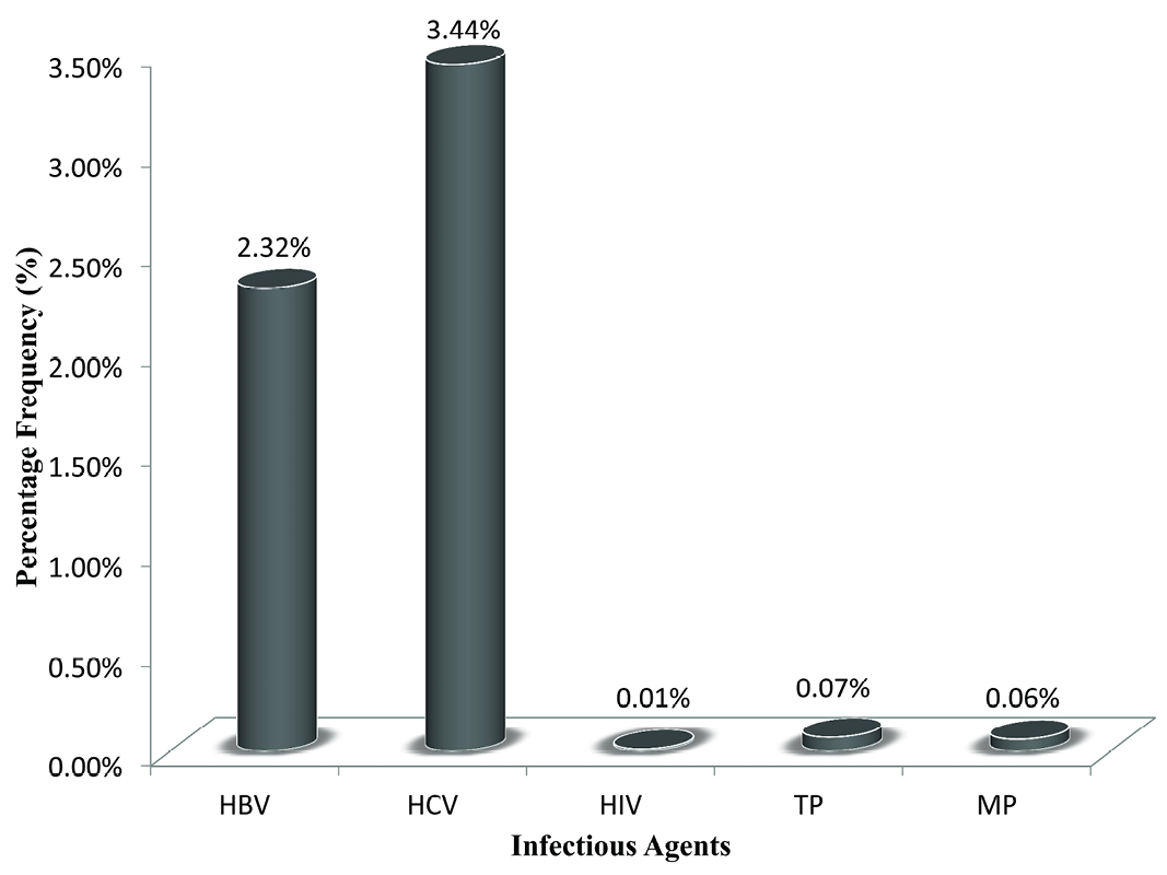 Frequency of potential transfusion-transmissible infectious agents detected among blood donations at NMCH, Multan during the year 2013