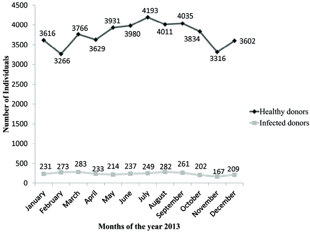 Distribution of healthy and infected blood donors among total bleedings received at Nishter Medical College and Hospital, Multan during the year 2013