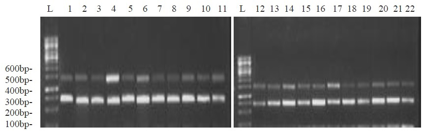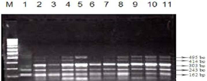 Multiplex PCR based gel electrophoresis of SCCmec type I (414bp) and III (243bp)