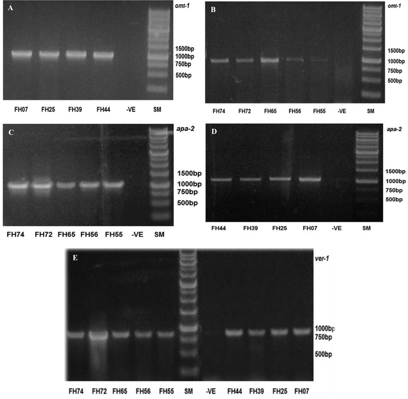 Gel electrophoresis examination showing specific bands of: (A & B) omt-1gene (Amplified 1,024bp); (C & D) apa-2 gene (Amplified 1,032bp); (E) ver-1 gene (Amplified 895bp) FH07: A. flavus; FH25: A. flavu; FH39: A. flavus; FH44: A. parasiticus; FH74: A. flavus; FH72: A. flavu; FH65: A. parasiticus; FH56: A.parasiticus; FH55: A. flavus; SM: 1kb DNA size marker; -ve control containing master mix without samples