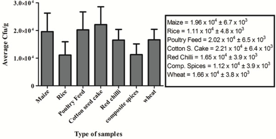 Average total yeast and mould count of different food commodities; Triplicate analyses were made for all measurements. Indicated values are means (n = 3) ± SD