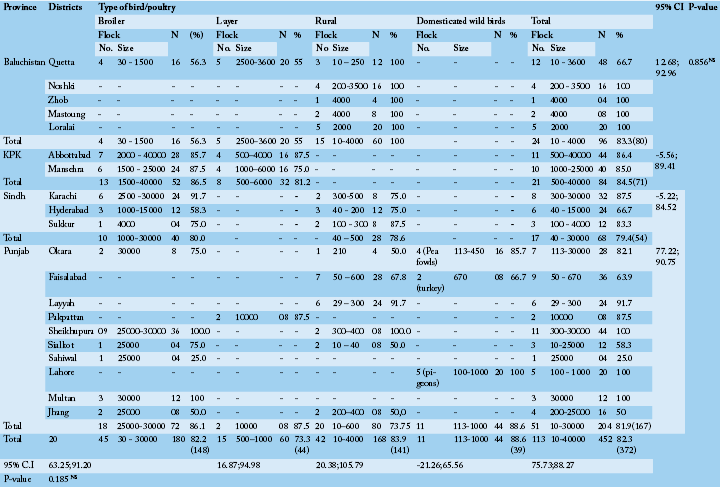 Distribution of antibodies to NDV with flock density, bird types and locale