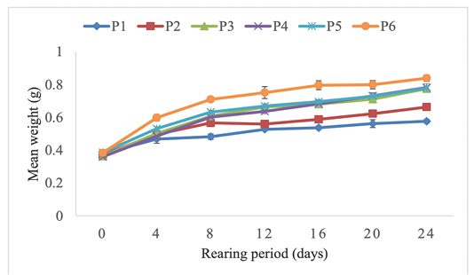 Effect of different feed protein rates on the body weight of Hoplobatrachus occipitalis tadpoles during the experiment.