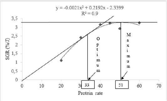 Relationship between specific growth rate and the different feed protein rates of Hoplobatrachus occipitalis fed on different protein rates for 24 days.
