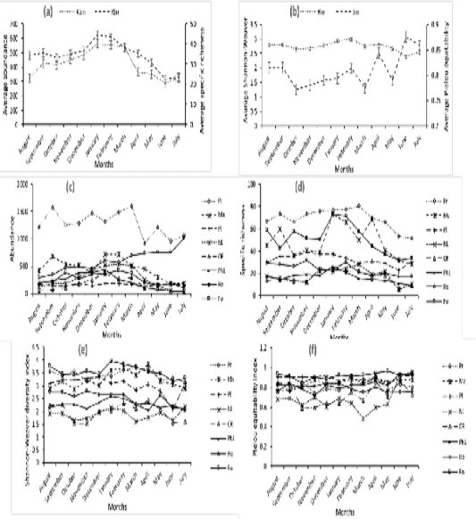 Temporal variation of the global and station diversity (a, b, c, d, e, f)