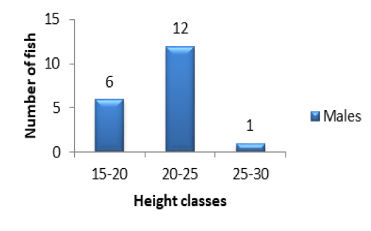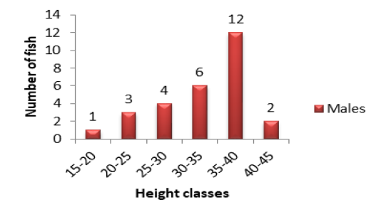 Variation of specimen number in relation to height classes in males of P. obscura in Lake Nokoué.