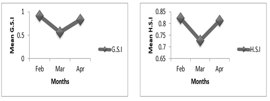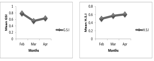 Variation of gonado-somatic and hepato-somatic indexes in females of P. obscura in Kakum River.